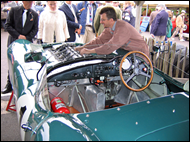 Fordwater Trophy Celebrating fifrty years of the 'E'-type. As you can imagine, I spent a great deal of time watching the Lightweights.. Of particular interest was number 10, (original registration 4 WPD), the famous "Coombs Lightweight" driven by Emanuele Pirro, left, just behind Martin Stretton who went on to win, sharing the glory with owner Jon Minshaw. Pirro won this race in 2005 but this time co-driver Desire Wilson wrecked the car coming up to the chicane far too fast. Gerhard Berger below left took second place in an exciting finish.Far left Colin Pearcy tweaks the Webers on his 1961 'E'-type. |