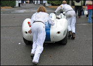 Fordwater Trophy Celebrating fifrty years of the 'E'-type. As you can imagine, I spent a great deal of time watching the Lightweights.. Of particular interest was number 10, (original registration 4 WPD), the famous "Coombs Lightweight" driven by Emanuele Pirro, left, just behind Martin Stretton who went on to win, sharing the glory with owner Jon Minshaw. Pirro won this race in 2005 but this time co-driver Desire Wilson wrecked the car coming up to the chicane far too fast. Gerhard Berger below left took second place in an exciting finish.Far left Colin Pearcy tweaks the Webers on his 1961 'E'-type. |